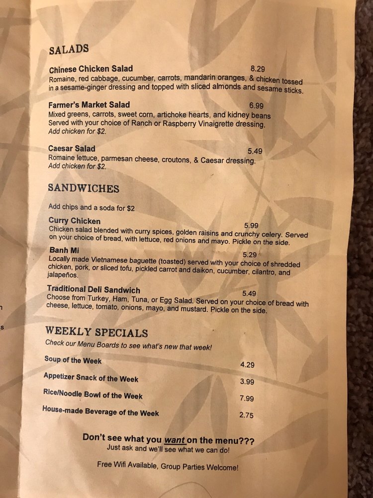On the menu, you'll discover an array of gourmet sandwiches such as the Banh Mi Sandwich, featuring fresh and zesty ingredients that are a delight for the palate. The Sweet Pork Banh Mi infuses traditional flavors with a hoisin BBQ twist. For lighter fare, the crisp and colorful salads, like the Farmer's Market Salad, provide refreshing options.